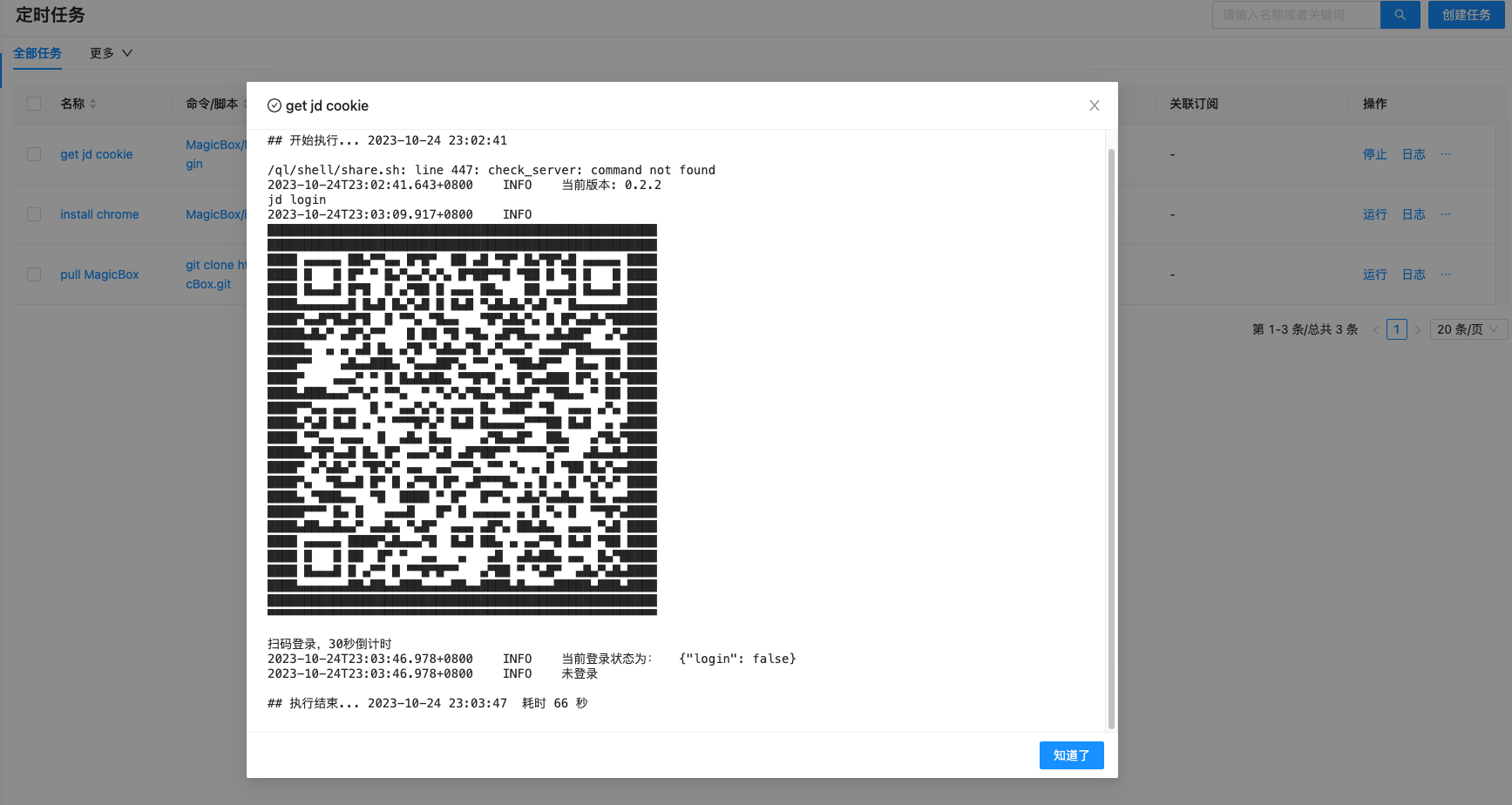 添加完成之后,点击执行,打开日志等待二维码出现扫码登录即可,正常会把cookie打印出。