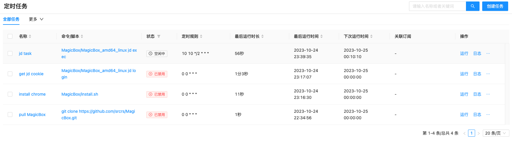 保留jd任务,其余三个为了拉取代码、安装环境、获取cookie的定时任务,可以设置为禁止执行,至此已全部完成。